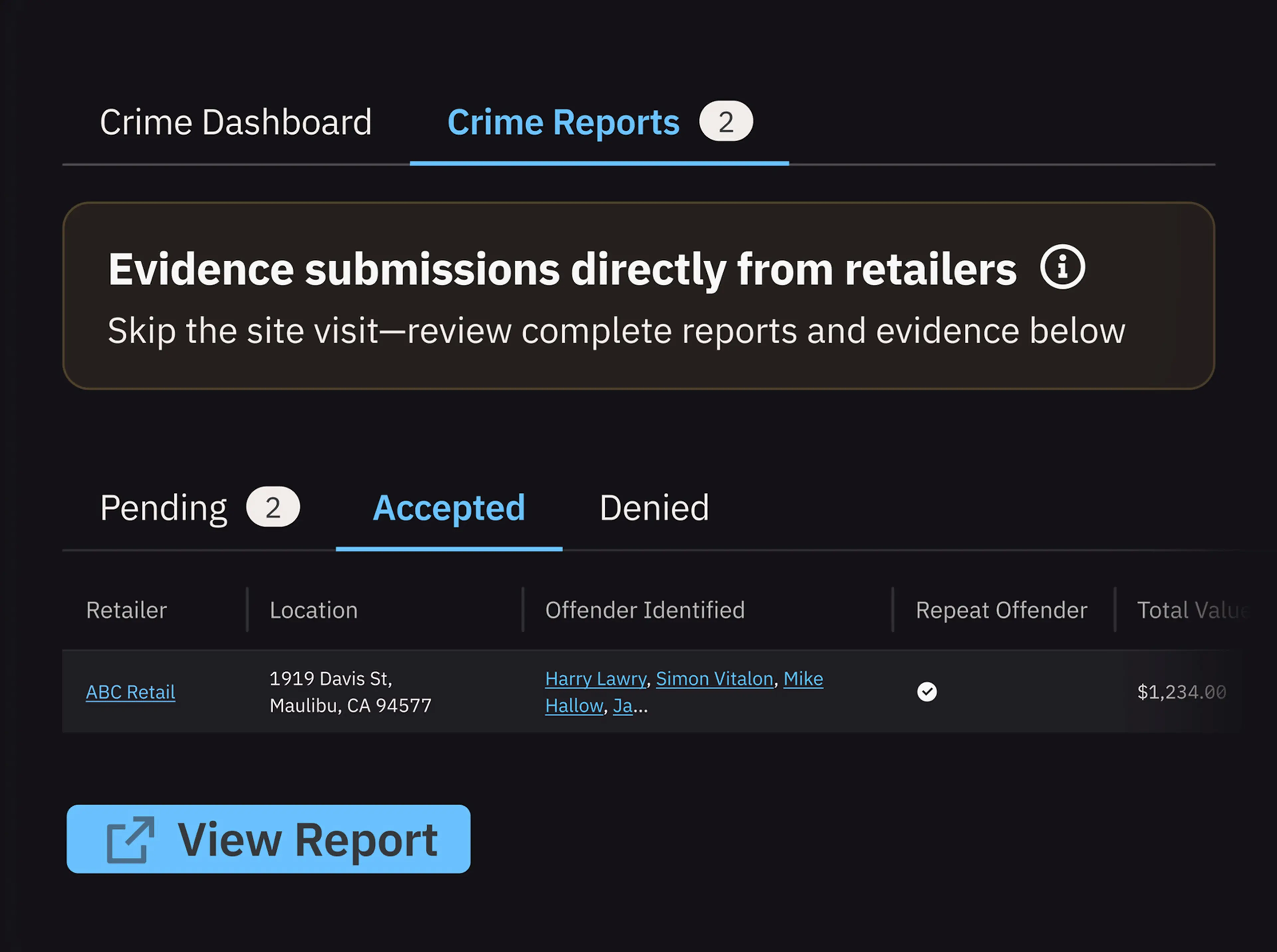 Identify the 10% of offenders who cause 70% of retail loss. The Retail Crime Hub surfaces repeat patterns and prolific networks so agencies can prioritize the cases that matter most.
