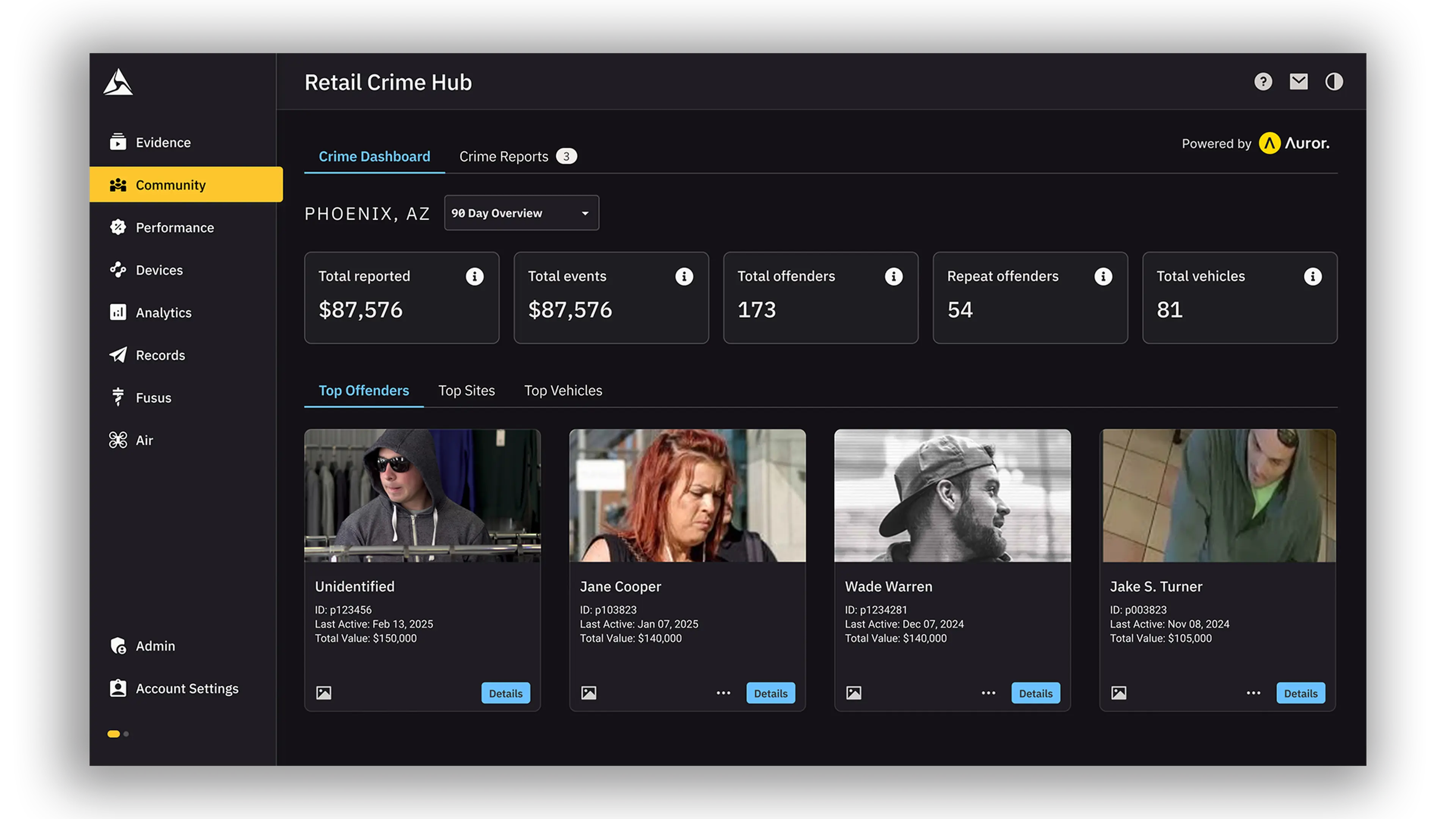 The Retail Crime Hub, powered by Auror and embedded within Axon Evidence, helps law enforcement combat organized and repeat retail crime. With structured incident data from over 26,000 retail locations, officers can quickly identify top offenders, securely collect digital evidence, and collaborate with retailers to close more cases — saving time and improving outcomes across jurisdictions.